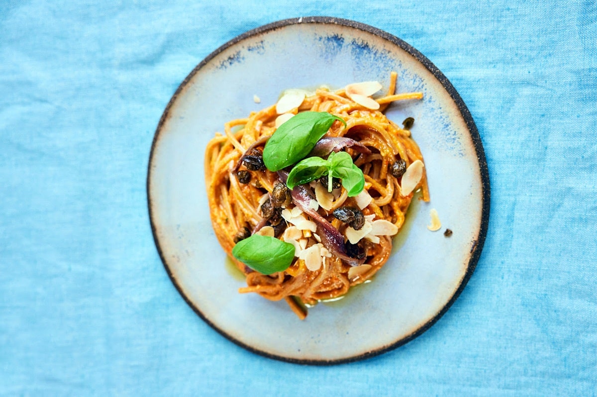 4. Condire gli spaghetti con il pesto di peperoni aiutandosi con poca acqua di cottura per ammorbidire la crema se necessario e con i capperi.