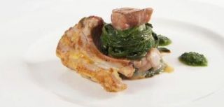 Lo Chef Leonardo Concezzi dal Mazagan Beach Resort El Jadida in Marocco, prepara una tipica ricetta della tradizione umbra: “Lombo di agnello arrotolato con lardo di Colonnata foglia d`oro, lasagnetta di patate e porcini, passata di piselli”.