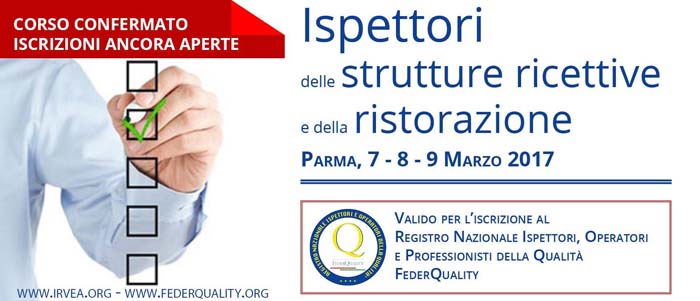 Parma, 7 – 8 – 9 Marzo – Il corso per Ispettori e consulenti delle strutture ricettive e della ristorazione, dopo nove edizioni su Roma approda presso la Camera di Commercio di Parma. Un corso, organizzato da IRVEA/Feder Quality (www.irvea.org – www.federquality.org) finalizzato a formare e perfezionare operatori e professionisti per il miglioramento dei servizi e degli standard qualitativi nelle strutture ricettive e di ospitalità.