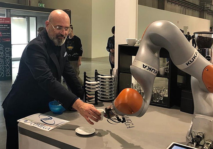 Il presidente ha quindi concluso il suo tour con un coffee break curioso: offerto da un robot, anzi no, un co-robot, uno degli esempi di robot collaborativi presenti in fiera. ‘’Si tratta di una nuova generazione di robot – commenta Andrea Bellini, amministratore dell’azienda Comega con sede a Cesena – in grado di sentire il peso e quindi in grado di fare un lavoro di precisione come porgere una tazzina di caffè”. E’ già al lavoro nelle ditte di cioccolato per movimentare e confezionare praline.