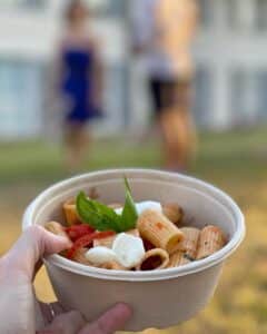 Ad esempio, a Milano abbiamo gustato, nel cestino: pasta fredda alla Capri con pomodorini sott’olio, mozzarelline e basilico; focaccia con formaggio vaccino e caprino, prosciutto San Daniele e mango (ottima idea da “rubare” anche a casa!; crumble al cocco con pesche e scaglie di cioccolato. E ovviamente acqua fresca e vini del territorio!