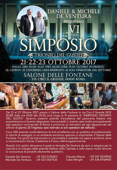 Durante il SIMPOSIO, inoltre, accanto alla presenza dei banchi d’assaggio, ci saranno anche numerosi momenti calendarizzati, dedicati a degustazioni guidate, lab di cucina, show cooking e seminari. Nella giornata di lunedì, infine, dedicata agli operatorii, avrà luogo la consegna del premio inedito “ECCELLENZE SIMPOSIO 2017”, attraverso il quale una giuria di esperti conferisce, a partire da quest’anno, un riconoscimento di alta qualità e prestigio a 100 locali super selezionati di Roma e provincia.