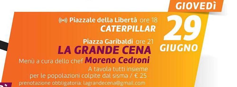 Si prosegue con ‘La Grande Cena’, in Piazza Garibaldi, alle ore 21, a tavola tutti insieme per le popolazioni colpite dal terremoto. Una cena per 1500 invitati, a cura dello chef stellato Moreno Cedroni.