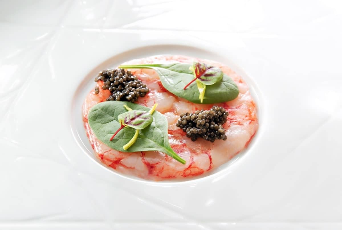 Carpaccio di gambero rosa, foglie di spinacino, zeste di lime e caviale