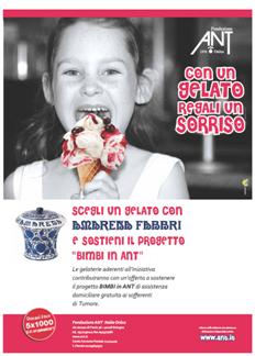 Al via anche quest’anno, a Bologna e provincia, “Con un gelato regali un sorriso”, la grande settimana del gelato organizzata in collaborazione con l’azienda bolognese Fabbri 1905 a sostegno della Fondazione ANT Onlus, che da oltre trent'anni garantisce assistenza socio-sanitaria domiciliare ai malati di tumore.