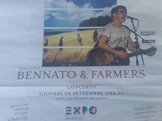 Milano Expo 2015. Presentato da Sveva Sagramola e Red Ronnie (e trasmesso in diretta su Rai3), “Edoardo Bennato & Farmers“ sono protagonisti giovedì 24 settembre alle 21 a Expo all’Open Air Theatre – di “Musica per la Terra“, serata evento organizzata da Eataly, Coop Italia, Coldiretti e SlowFood per celebrare contadini, allevatori, pescatori, produttori di cibi italiani di qualità: i veri protagonisti dell’agroalimentare italiano.