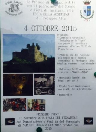 Da segnare in agenda il 15 novembre 2015, prossimo appuntamento a Predappio Alta con la “Festa dei Vignaioli”, dove, oltre al Sangiovese, si potrà degustare e acquistare anche il formaggio di grotta stagionato nelle “Grotte della Zolfatara” produzione 2015.