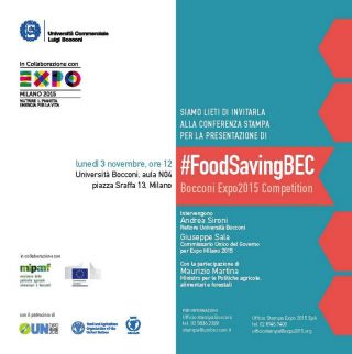 L’Università Bocconi, con la collaborazione di EXPO Milano 2015, Ministero delle politiche agricole e Commissione europea, chiama a Milano 200 studenti universitari da tutto il mondo per una settimana di studio, teamwork e sfida sui temi dello spreco alimentare: #FoodSavingBEC – Bocconi EXPO2015 Competition, alla Bocconi dal 24 giugno all’1 luglio 2015. L’iniziativa gode del patrocinio di Onu per EXPO2015, Fao e Programma alimentare mondiale.