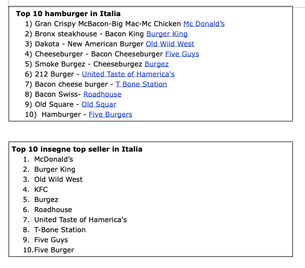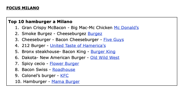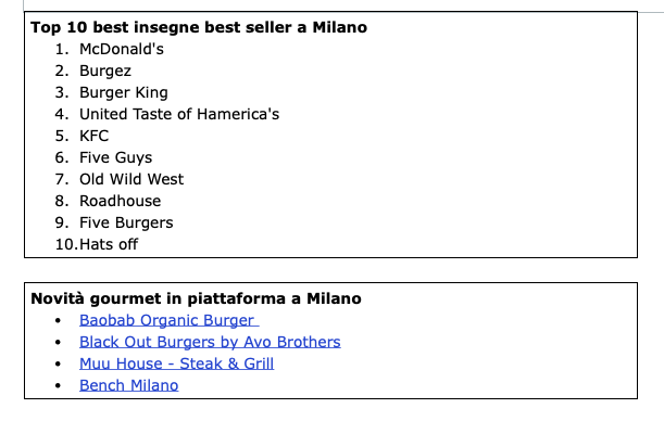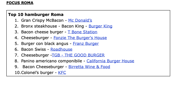 Analizzando le evidenze emerse nelle prime due città amanti dell’hamburger a domicilio emergono somiglianze e differenze. In entrambe le città il preferito in assoluto è il celebre Gran Crispy McBacon di McDonald’s. A Milano molto apprezzati anche lo smoke Burgez di Burgez e cheeseburger di Five Guys mentre a Roma vanno per la maggiore anche il Bronx steakhouse e il  Bacon King di Burger King e il bacon cheeseburger di T Bone Station. In termini di insegne, oltre a McDonald’s e Burger King che raccolgono unanimi consensi in entrambe le città, Burgez e United Taste of Hamerica’s a Milano e T Bone Station e KFC a Roma,  sono in assoluto tra le preferite nelle due città.