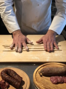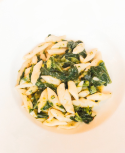 “Questo piatto nasce dai pastori di un tempo, durante la transumanza. A Foggia, in Puglia, c’erano le orecchiette con le cime di rapa. Da quello presero l’ispirazione, “importarono” questa ricetta in Abruzzo” spiega lo chef “Ma anzichè le orecchiette, fecero i cazzelletti: degli gnocchetti sottili ma carrati. Nel periodo delle cime rapa si fanno con quelli ma se no si fanno tutto l’anno i “cazzelletti con le foglie”, quindi con verdura di stagione”