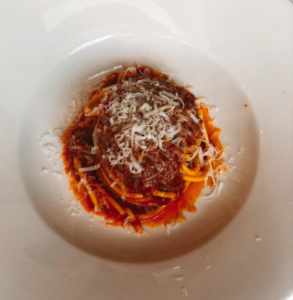 Tra i primi piatti, spaghetti alla chitarra e cazzelletti “con le foglie” (ovvero con verdure di stagione), fatti a mano.