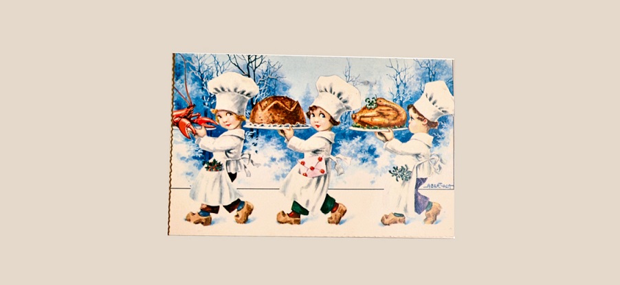 La prima è una cartolina vintage che vede raffigurati tre piccoli cuochi che, operosi, portano le loro prelibatezze su grandi vassoi, tutti in fila sulla neve. Al centro, preceduto e seguito da ricche preparazioni, c’è il panettone, re delle feste, che solennemente viene portato sulle tavole, quasi in processione.