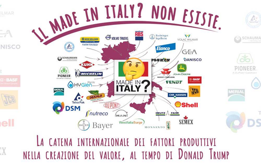 “Passare alla logica di "Prodotto Italiano" – aggiunge Roberto Brazzale – significa identificare e classificare un prodotto la cui realizzazione coinvolge in misura necessaria e significativa territorio, fattore umano e fattore culturale, in relazione al quale la creazione di valore aggiunto economico sia apprezzabilmente attribuibile e di pertinenza dei cittadini italiani e dell’Italia. L'italian sounding, per esempio, non sarebbe "prodotto italiano" perché difetta della territorialità. Una tunica cinese realizzata a Prato non sarebbe "prodotto italiano" perché difetta del fattore culturale. Una pizza realizzata in USA da un vietnamita non sarebbe "prodotto italiano" perché difetta del coinvolgimento del fattore umano. Possediamo una grandissima abilità e creatività nella trasformazione e lavorazione degli ingredienti, per parte notevole ancora inespressa a causa dell'ostilità verso gli sviluppi resi possibili dall’internazionalizzazione dei cicli produttivi. Oltretutto, il Made in Italy in purezza non esiste. Non può esistere per l'incredibile ampiezza e complessità della catena internazionale degli input dai quali ogni prodotto realizzato nel territorio della Repubblica Italiana è realizzato. Il valore finale del prodotto sarà la somma di una cooperazione involontaria di tutto il pianeta, di infinite frazioni di valore realizzate nei luoghi più disparati del pianeta e convergenti nel prodotto finito che definiamo Made in Italy. Un trattore John Deere comprato e usato nei campi, in Italia, produce valore in Usa e a sua volta è stato realizzato con infiniti input che coinvolgono infiniti luoghi. Un fertilizzante Basf lo produce in Germania. Il gasolio che utilizziamo ogni giorno nei processi di raccolta delle materie prime agricole e di trasformazione, genera ricchezza in Arabia Saudita”.