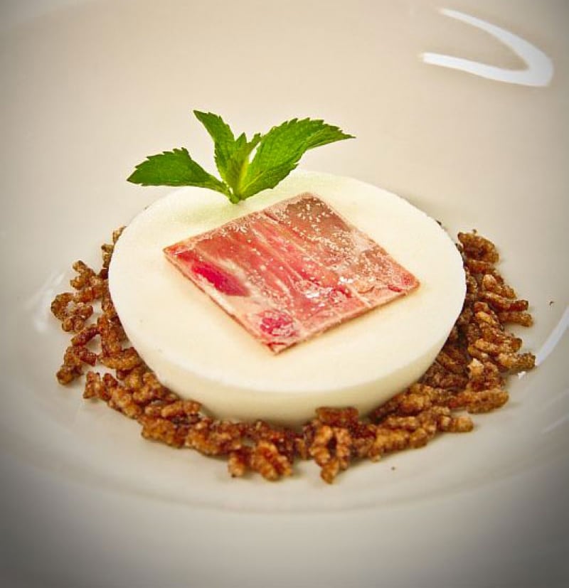 Gelato al riso, salsa alle castagne, Parmigiano Reggiano, riso soffiato, Prosciutto di Parma e Olio di nocciola Piemonte Pariani