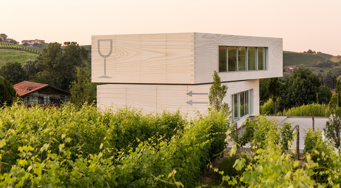 I due volumi evocano le cassette, non solo per le forme e i materiali usati nel rivestimento esterno – in legno per un maggior rispetto dell’ambiente –, ma anche per i tipici elementi grafici dei contenitori in legno per vini, appunto, che diventano così decorazione dell’architettura insieme all’anno di inizio (2010) e a quello di fine costruzione (2016) dichiarati in facciata.