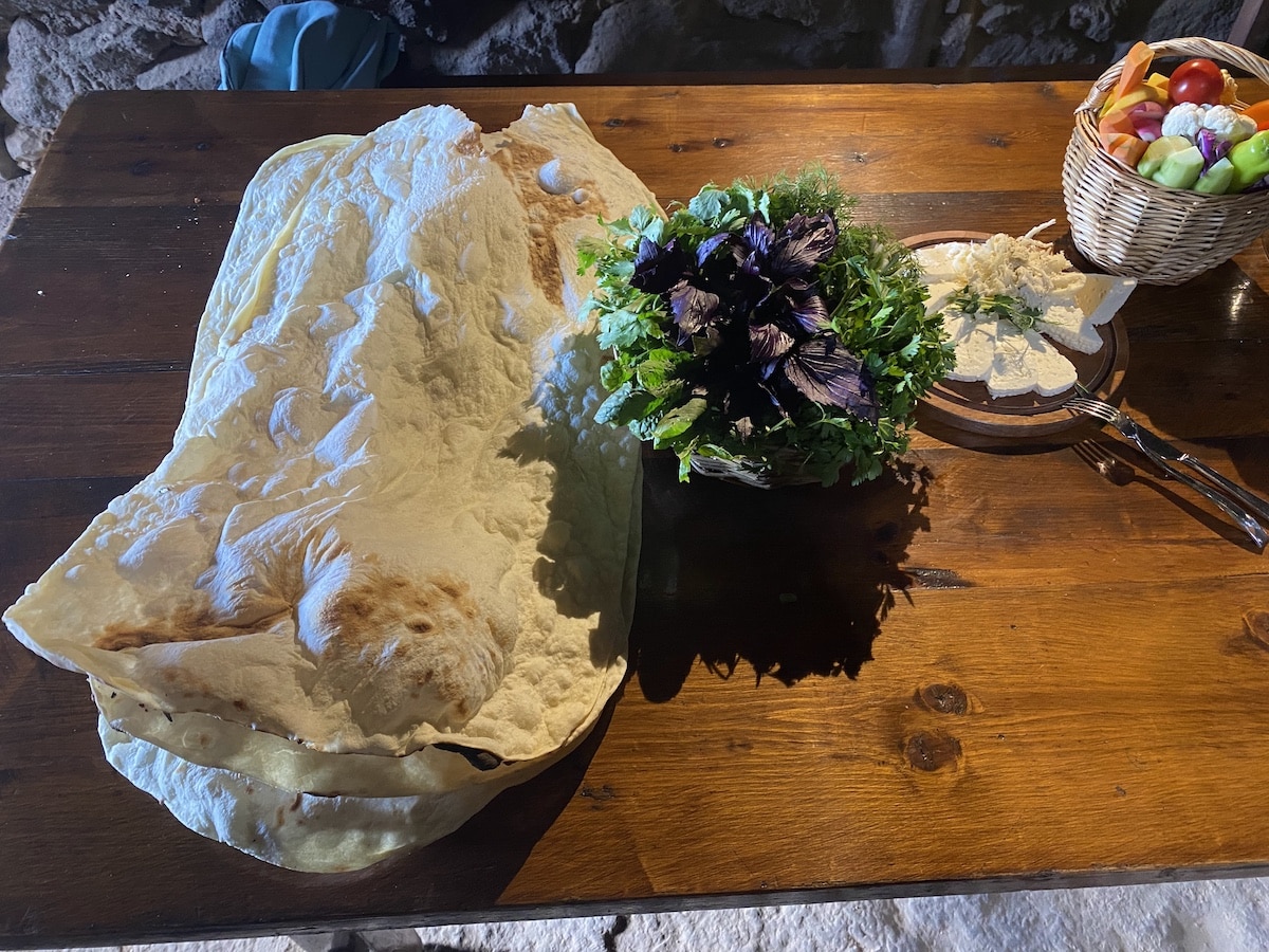 - Come accompagnamento: è spesso servito come piatto per raccogliere altre pietanze, come hummus, baba ghanoush, yogurt, formaggi, carne grigliata o verdure. A me è stato come spuntino da farcire con erbe aromatiche, amatissime nella cucine armena, e formaggio.