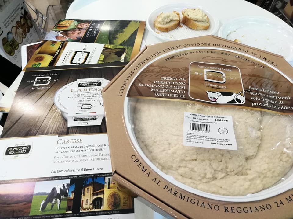 Tra le tante novità che la Bertinelli ha portato in vetrina a Marca 2019 è rappresentata dalla Crema al Parmigiano reggiano Dop Millesimato 24 mesi. Assolutamente naturale, priva di conservanti e lattosio, questa crema è preparata utilizzando Malvasia dei colli di Parma, olio e Parmigiano reggiano Dop Millesimato (70%). Un Parmigiano particolare, perché ottenuto esclusivamente con il latte vaccino crudo proveniente da bovine che abbiano partorito da non più di 100 giorni. Rispetto a quello “normale”, questo latte ha un contenuto proteico e di calcio sensibilmente maggiore ed è particolarmente adatto alla produzione di formaggi a pasta dura perché cede spontaneamente l’acqua che contiene. Essendo più concentrato, questo latte può essere cotto meno, con il risultato che la colonia di “batteri buoni” che danno al Parmigiano reggiano il suo caratteristico aroma e il suo inconfondibile sapore è più numerosa. La Crema che ne risulta è una salsa appetitosa ed estremamente versatile, che si sposa con primi piatti (in particolare, è da provare come condimento dei tortellini) e risotti. È ottima anche come appetizer, spalmata su crostini oppure come farcitura di barchette di pasta brisé, accompagnata a mousse di salmone o a frutta fresca, dall’uva ai frutti rossi.