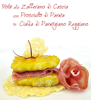 Primo assoluto: "Trota allo Zafferano di Cascia con Prosciutto di Parma su Cialda di Parmigiano Reggiano"