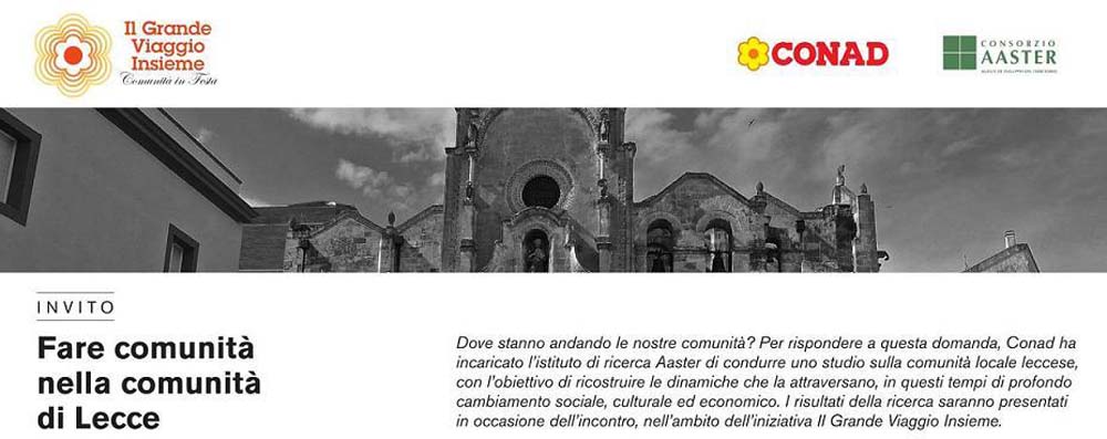 Lo studio è stato presentato e illustrato oggi, venerdì 30 giugno, nel corso dell’incontro “Fare Comunità nella Comunità di Lecce”, presso l’Auditorium della Parrocchia di San Giovanni Battista con le relazioni di Aldo Bonomi, direttore del Consorzio Aaster, di Francesco Pugliese, amministratore delegato Conad e di Carlo Salvemini, sindaco di Lecce.