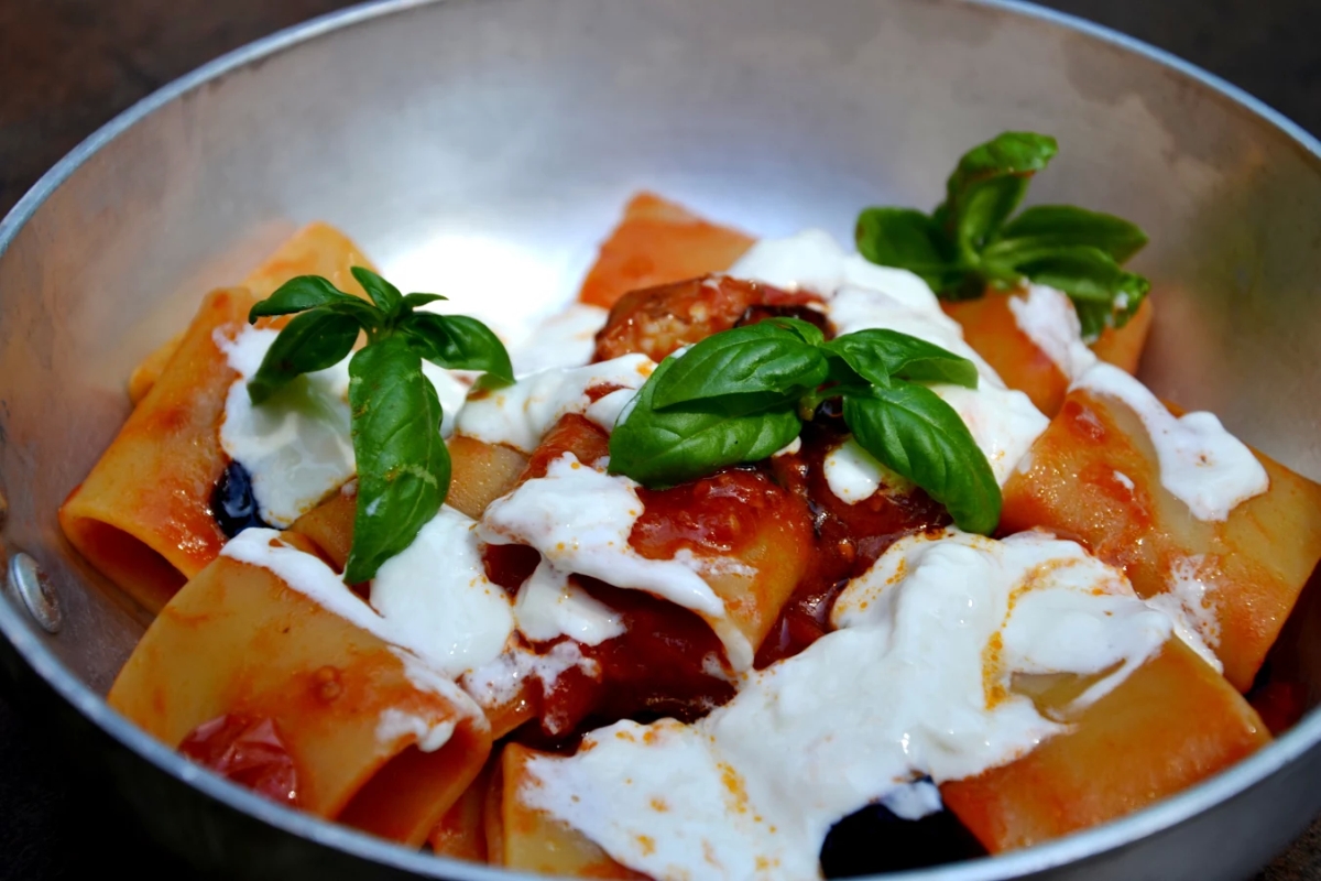 Pacchero con melanzana croccante, pomodorino del Piennolo, stracciata di bufalo