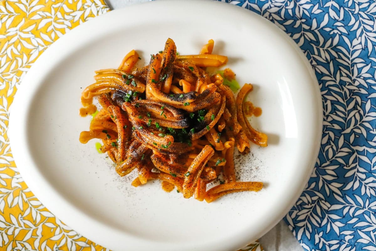 Strozzapreti di farina di ceci con mirin e cipolla bruciata
