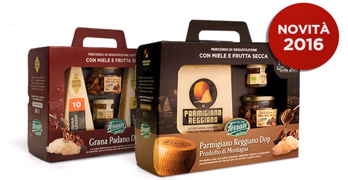 Ma anche gli abbinamenti di una selezione unica di formaggio con salse dolci piccanti, mieli, condimento balsamico e Presidi Slow Food®. Come le confezioni: Parmigiano Reggiano Prodotto di Montagna 30 mesi con salse dolci piccanti (250 gr. € 8,45), Parmigiano Reggiano Prodotto di Montagna 30 mesi con Presidi Slow Food® (600 gr. € 17,85), Grana Padano 16 mesi con condimento balsamico (400 gr. € 8,90), Grana Padano Riserva con selezione di mieli (600 gr. € 12,95).