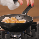 Un altro trucco di questa ricetta è non soffriggere lo scalogno: se la materia prima è buona e di qualità, non serve aggiungere gusti come appunto il soffritto. Facciamo stufare lo scalogno tritato con una miscela di olio e acqua, a fuoco moderato, in modo che non frigga. Sarà in questa base, più leggera e con meno olio, che faremo rosolare il pollo, a cui aggiungeremo il curry (tanto, il consiglio di Erica è di usare una miscela di curry buona e di non lesinare) e poi il latte di cocco, con cui creare una salsa.