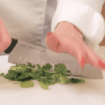 Mentre aspettiamo che il riso diventi pronto e il pollo finisca di rosolare, puliamo il coriandolo, o in alternativa il prezzemolo, sminuzzandoli.