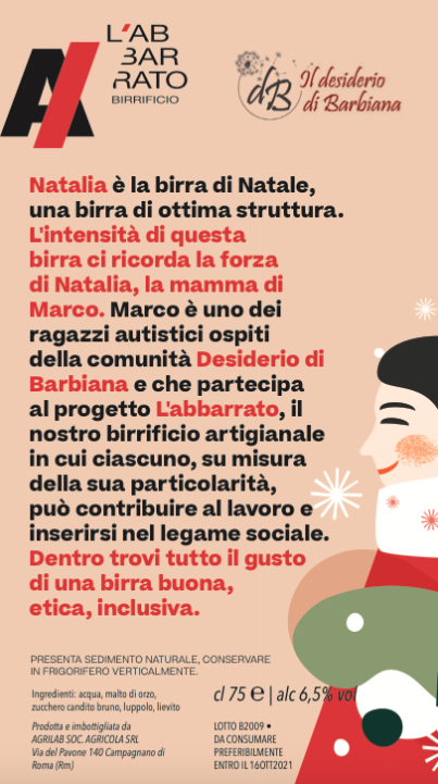 La birra di Natale – cl 75 ℮|alc 6,5% vol, acquistabile telefonicamente (+39 331 2222333) al costo di 12,50 euro e in fusto al costo di 78€ + IVA – ha un’ottima struttura e intensità che ricorda la forza di Natalia, da cui prende il nome l’etichetta, mamma di Marco, uno dei ragazzi autistici ospiti della comunità Il Desiderio di Barbiana che partecipa al progetto L’Abbarrato.