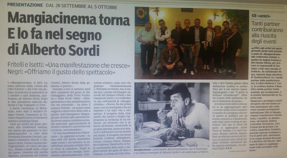 Salsomaggiore giugno 2016. Mangiacinema si farà. La terza edizione della Festa del Cibo d’autore e del Cinema goloso si terrà dal 28 settembre al 5 ottobre e sarà dedicata, quest’anno, ad Alberto Sordi, dopo le due precedenti edizioni dedicate a Ugo Tognazzi e a Totò. A darne l’annuncio, in Municipio, sono stati il sindaco Filippo Fritelli, l’assessore al Turismo Daniela Isetti e il direttore artistico Gianluigi Negri.