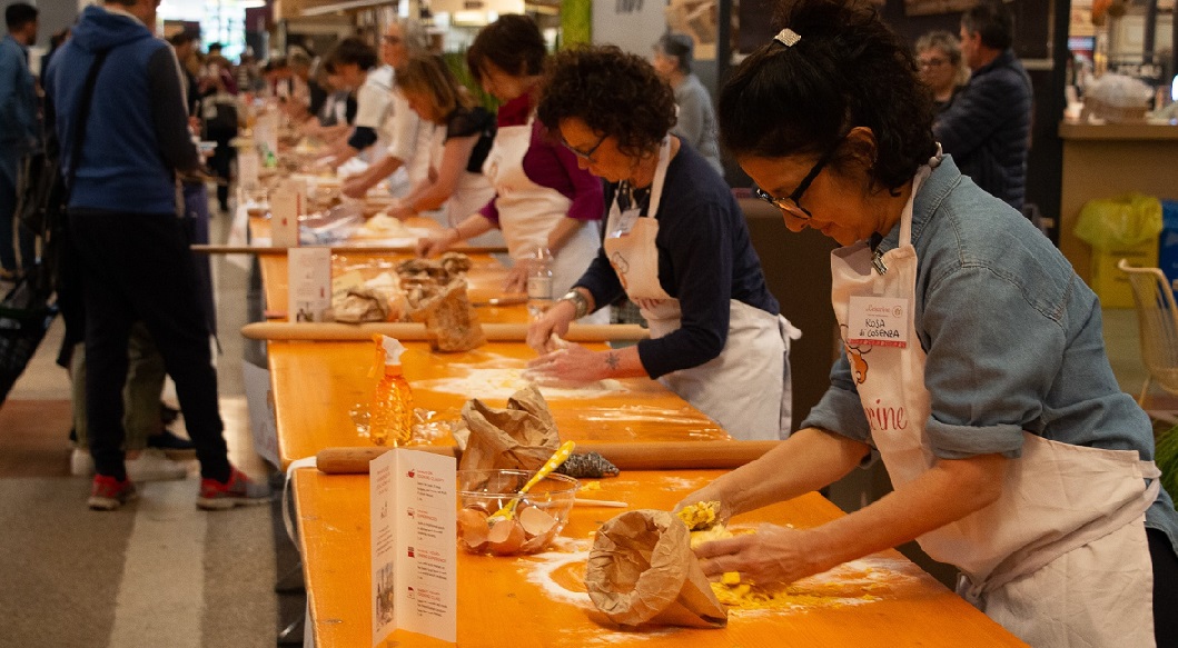 Nel giorno della festa della mamma, lo “sfoglina day” ha visto all’opera un dream team arrivato da tutta la Penisola: i giovani della start up bolognese SfogliAmo, la cooperativa di ragazzi e ragazze che realizzano la pasta fresca a Eataly World; le Cesarine, la più antica rete di cuoche casalinghe d’Italia arrivate a Bologna da Piemonte, Abruzzo, Lazio, Veneto, Calabria, Toscana, Sicilia, Umbria, Lombardia e da tutta l’Emilia Romagna; le Mariette di Casa Artusi, che insegnano nei corsi della scuola del centro di cultura dedicato al padre della cucina italiana; le famose sfogline bolognesi e quelle dell’associazione La San Nicola di Castelfranco Emilia.