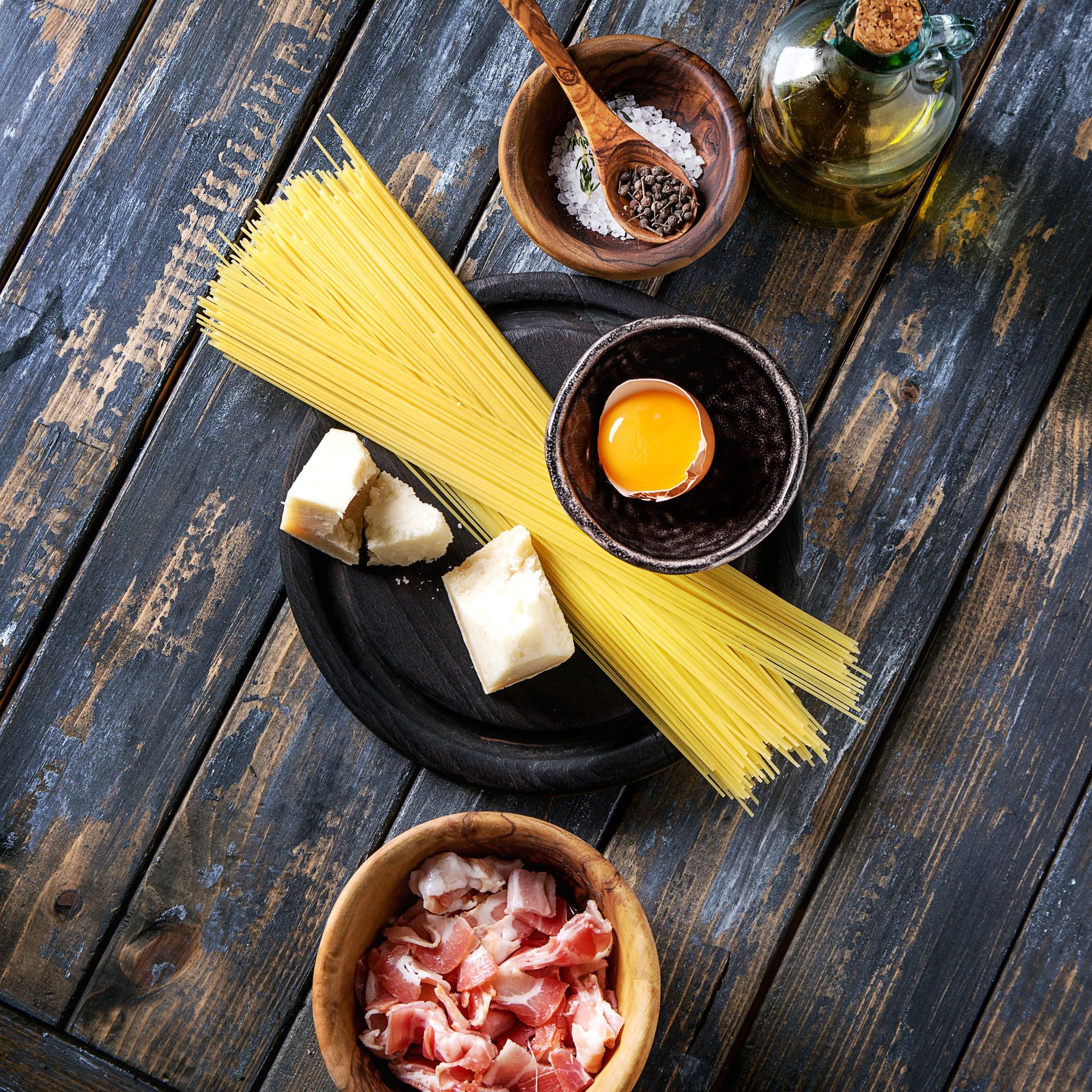 La tradizione prevede solo 5 ingredienti: guanciale, pecorino (o grana stagionato), uovo, sale e pepe. Ma da dove proviene? Ci sono varie scuole di pensiero. Secondo alcuni la carbonara sarebbe stata inventata in America, precisamente nel 1944 dall’incontro fra la pasta italiana e gli ingredienti della ‘Razione K’ dei soldati americani (tuorlo d’uovo in polvere e bacon). Risalendo la Penisola, i militari americani accompagnavano la ‘Razione K’ agli spaghetti per integrare la dose di carboidrati.