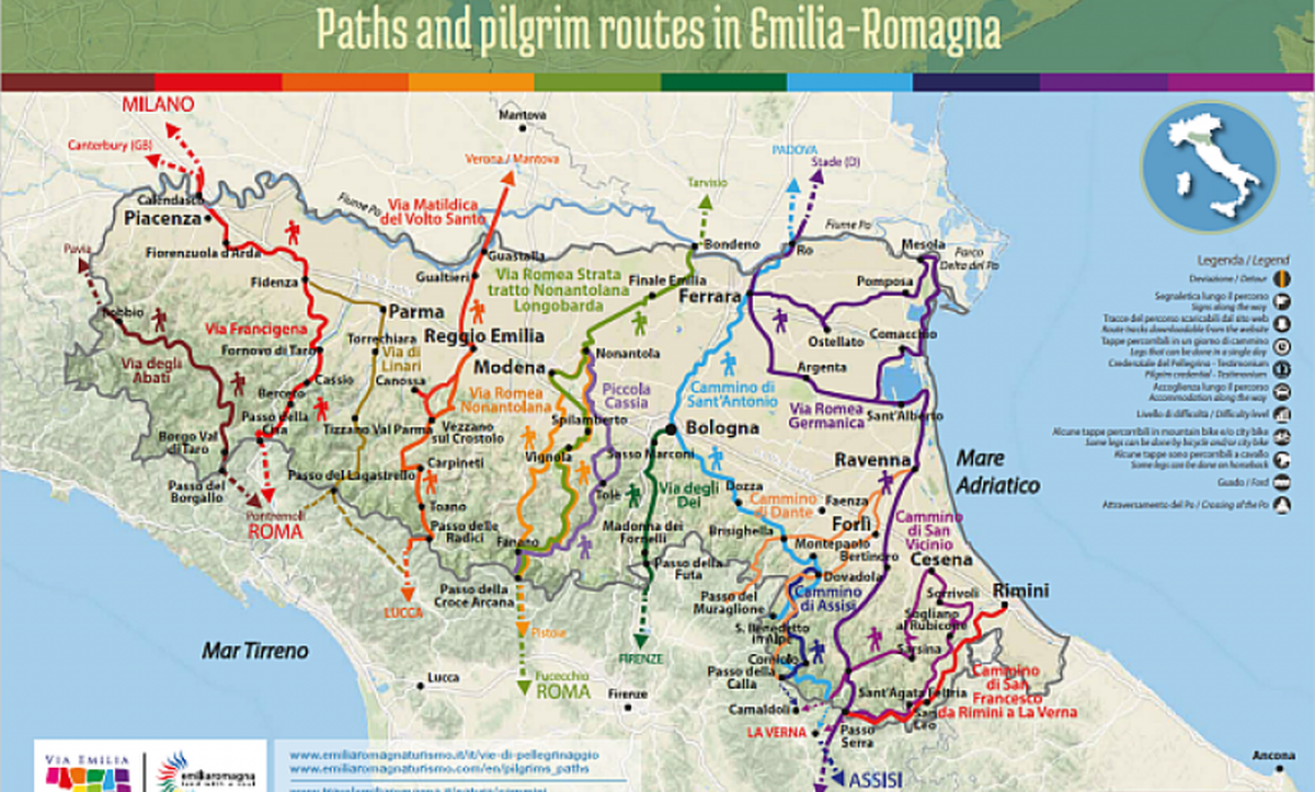 Un’ingente mole di informazioni, raccolta da Apt Servizi Emilia Romagna, ente di promozione turistica regionale, grazie al coinvolgimento diretto della Regione Emilia Romagna, dei referenti dei singoli cammini e del MIBACT, che proprio recentemente ha realizzato il primo Atlante Ufficiale dei Cammini d’Italia, che mappa 41 delle più belle “vie verdi” italiane (www.camminiditalia.it) di cui 11 rientrano nel progetto regionale dell’Emilia Romagna.