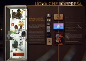 Le sorti dell’impero di Gualino, per la sua opposizione al fascismo e forse per azzardi finanziari, volgono al peggio agli inizi degli Anni Trenta del Novecento: l’imprenditore viene spedito al confino e la Unica passa alla Banca d’Italia, che ne risolve le sorti attraverso la fusione con la Venchi, sotto la guida di Gobbi. Sono anche gli anni di grandi innovazione nel mondo dell’arte cioccolatiera, da parte delle due aziende: la Unica già nel 1931 produce i primi mini-gianduiotti, come testimonia un catalogo dell’epoca, mentre qualche anno più tardi la Venchi Unica distribuisce sul mercato le innovative tavolette ripiene, con il marchio “Praletta” (tavoletta+pralina). Anche le uova di Pasqua con sorpresa diventano un regalo popolare tra gli italiani, mentre i grandi cartellonisti dell’epoca, in stile futurista, impreziosiscono la pubblicità aziendale: appesi alle “americane” della Sala Fucine Ogr, la mostra presenta 15 riproduzioni di poster provenienti dal Museo del Manifesto di Treviso, Collezione Salce, realizzati da artisti come Fortunato Depero [nella foto sotto un suo manifesto per le uova di Pasqua], Marcello Dudovich, Francesco Seneca, Leonetto Cappiello e Severo Pozzati.