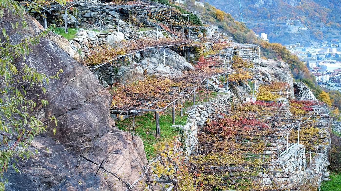 I vigneti della bassa Valle rispondono in pieno alla definizione di “Vigneti eroici” in quanto collocati su terrazze e gradoni con una pendenza superiore al 60%. Sono queste estreme condizioni morfologiche che hanno obbligato da sempre l’uomo a un lavoro faticoso in ogni sua fase, tutto rigorosamente effettuato a mano su scalini secolari che si differenziano tra loro nella misura. Alzate che possono variare dai 10 ai 32 centimetri imponendo un passo sempre differente. Gli stessi terrazzi sono diversi, alcuni più in piano, altri meno.